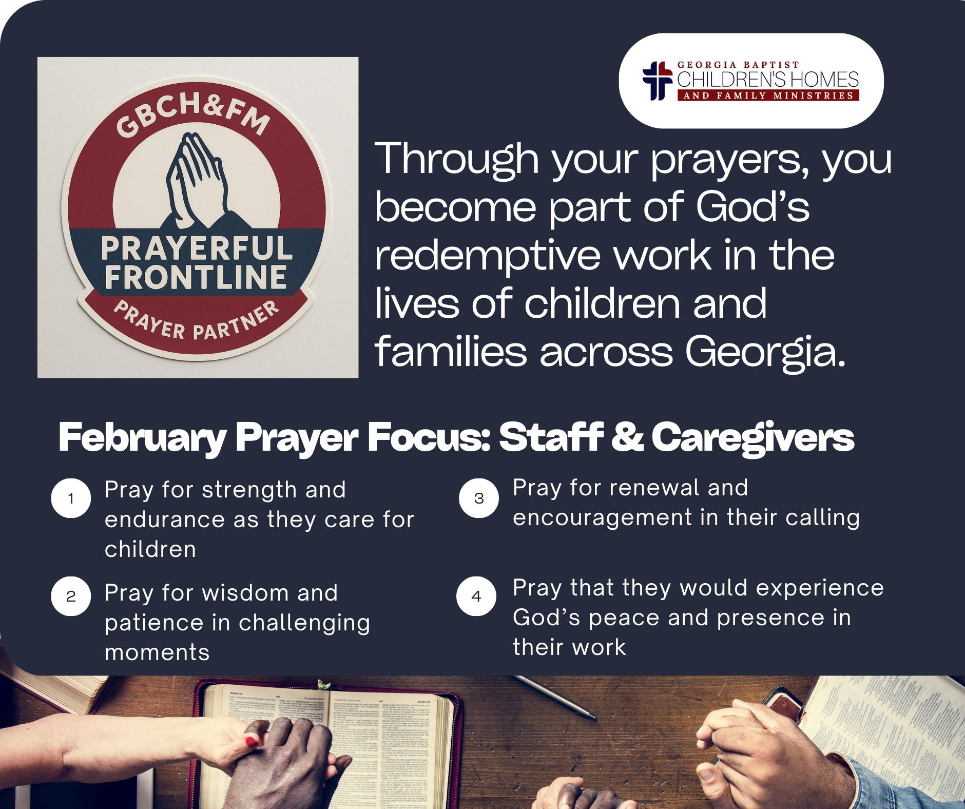 That’s why we’re excited to launch The Prayerful Frontline, a new initiative inviting churches and believers across Georgia to stand shoulder to shoulder with our staff through intentional, ongoing prayer.